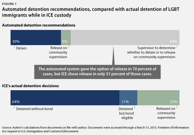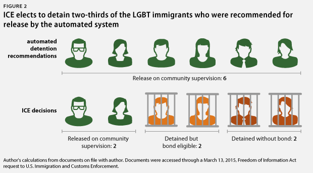 Además, los oficiales de ICE anularon la RCA y optaron por detener a dos de cada tres personas LGBT para el que la herramienta RCA solamente recomienda la liberación. Aun cuando los agentes de ICE establecer un vínculo que el detenido puede pagar para ser puesto en libertad en espera de una audiencia, a menudo es demasiado alto: Bonos a menudo comienzan en un mínimo de 1.500 dólares, pero puede ir todo el camino hasta $15.000, dependiendo de la evaluación de un oficial.